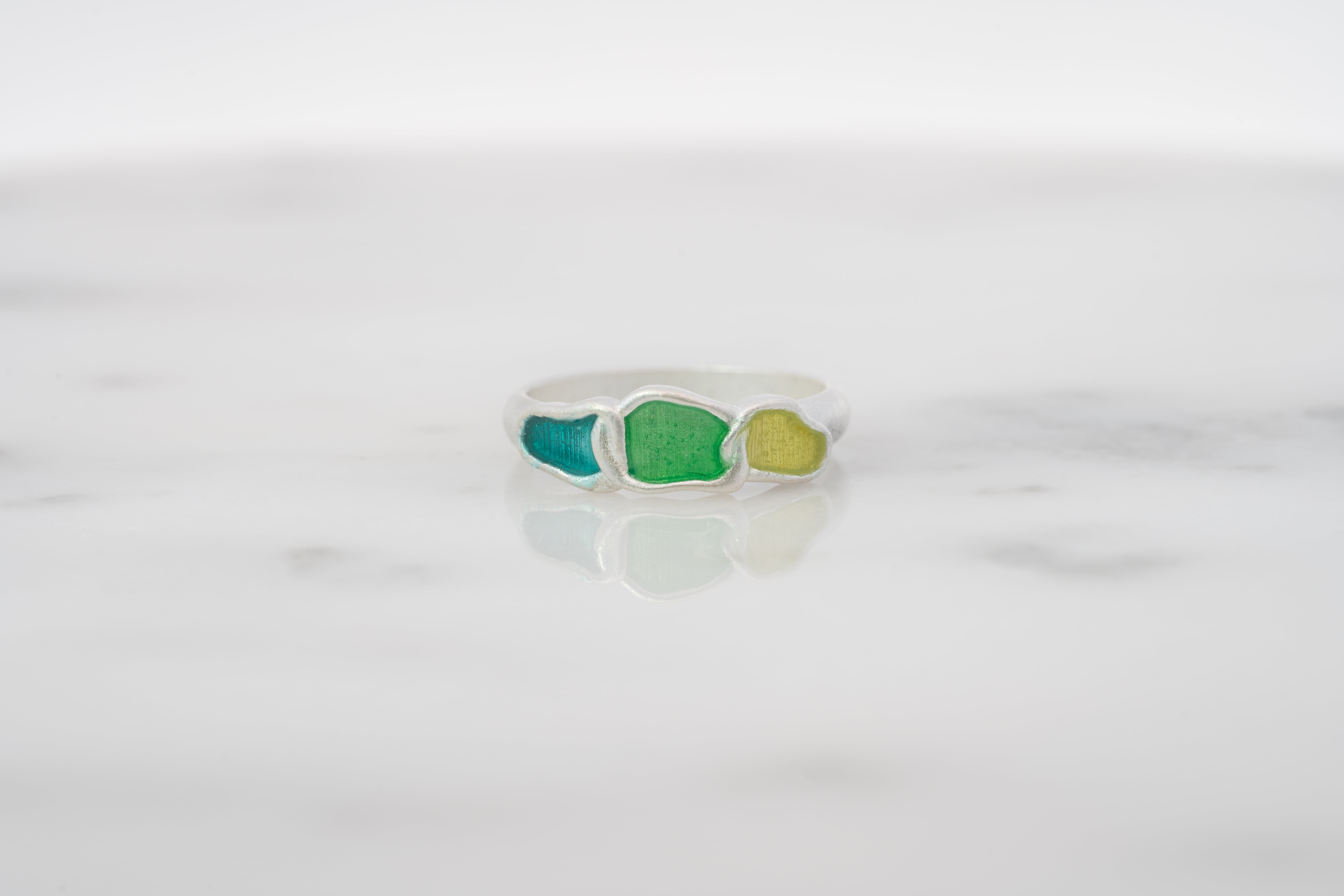エマーユリングとは、ガラス質の釉薬(エマーユ)を金属に施し、高温で焼成することで色を定着させる指輪のことです。