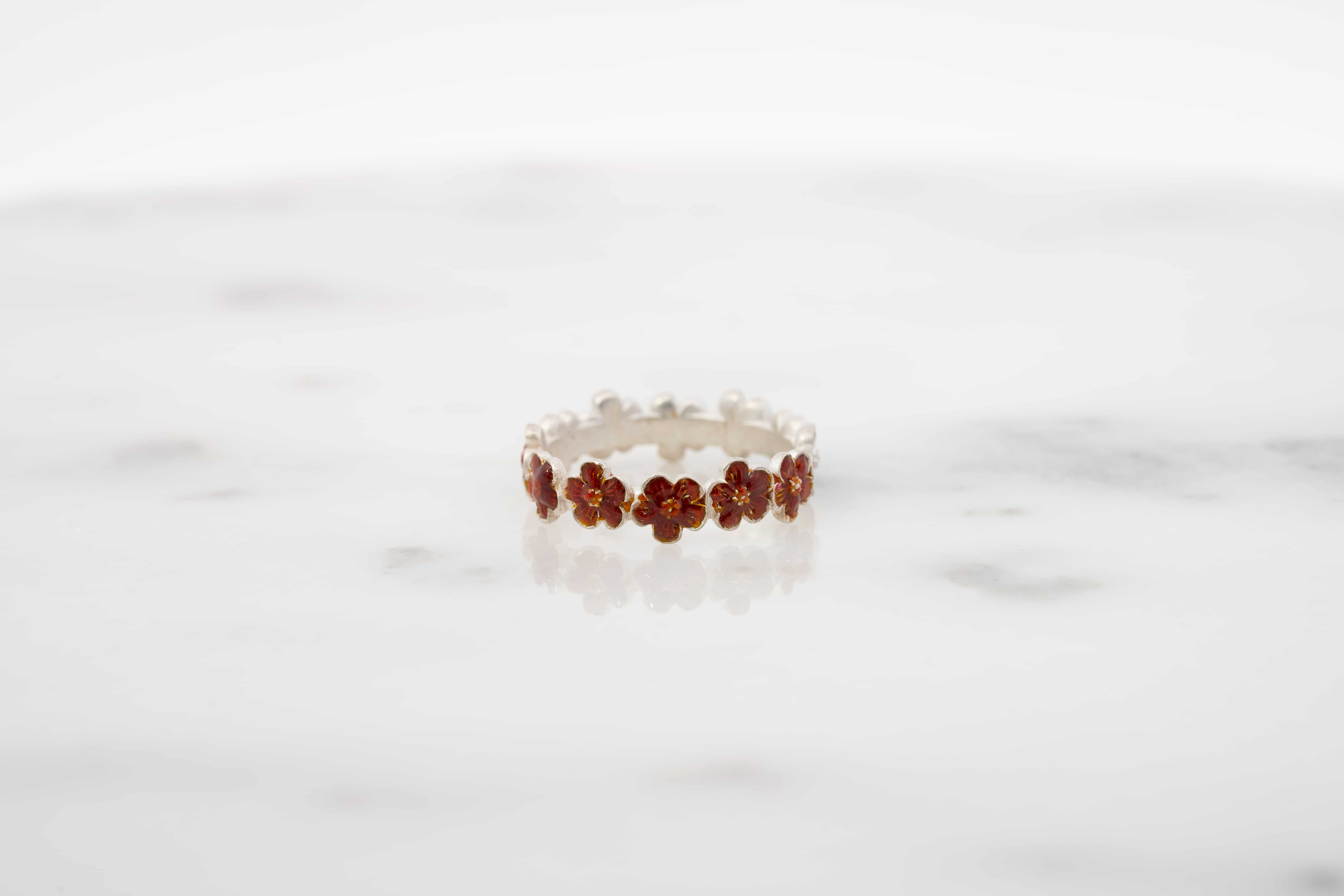 赤1色で仕上げた花モチーフのエマーユリングです。